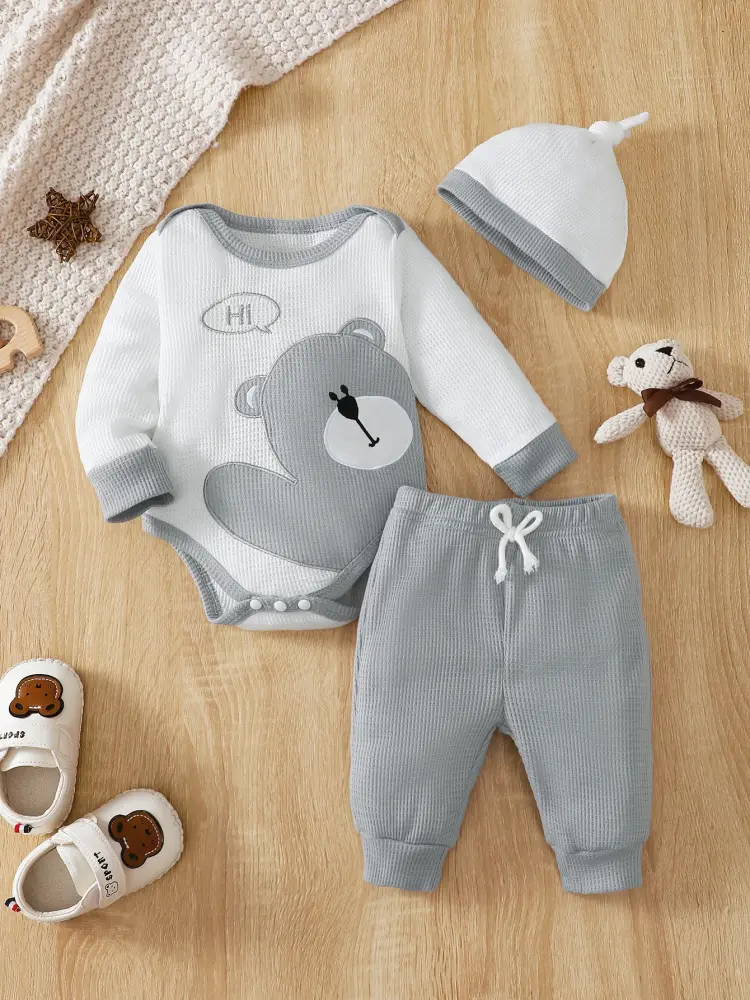 احصل على طقم بذلة مثلثة مطرزة بأكمام طويلة وملمس وافل مع طقم قبعات كاجوال الآن من Qurrataini Store لإطلالة أنيقة ومريحة لطفلك الصغير.